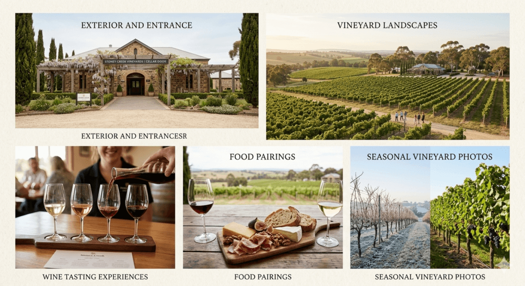 A good starting point is around 15–30 high-quality photos showing the vineyard, cellar door, wine tastings and food pairings.